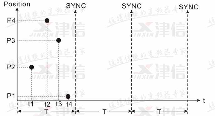10MC 接有四臺伺服驅動器,T 為同步周期。在同步周期內,四臺伺服驅動器分別在不同的時刻(t1、t2、t3、t4)接受到控制數據,但是控制數據并沒有生效。當伺服驅動器接收到同步信號(SYNC),控制數據同時生效。